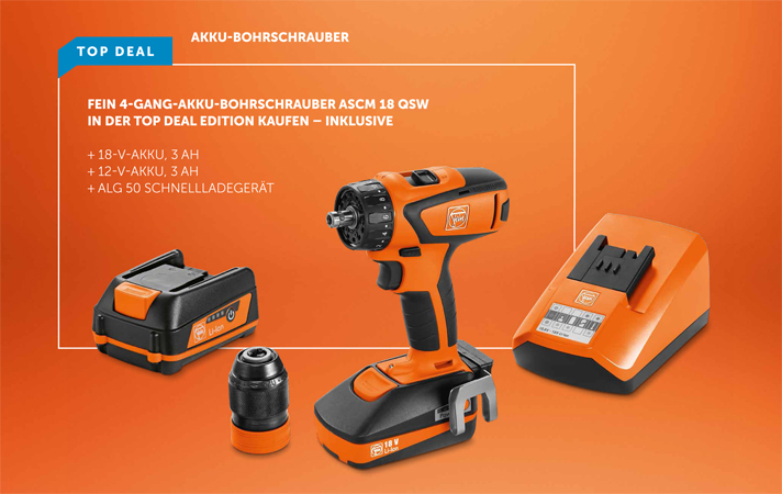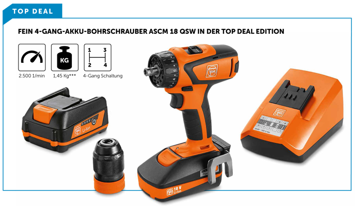 Der FEIN 4-Gang-Akku-Bohrschrauber ASCM 18 QSW mit Quick-In und MultiVolt-Schnittstelle kann je nach Art der Anwendung mit 12V- oder 18V-Akku benutzt werden. In der Top Deal-Edition bietet der ASCM 18 QSW die perfekte Ausstattung für den Einstieg in die FEIN Akku-Welt.